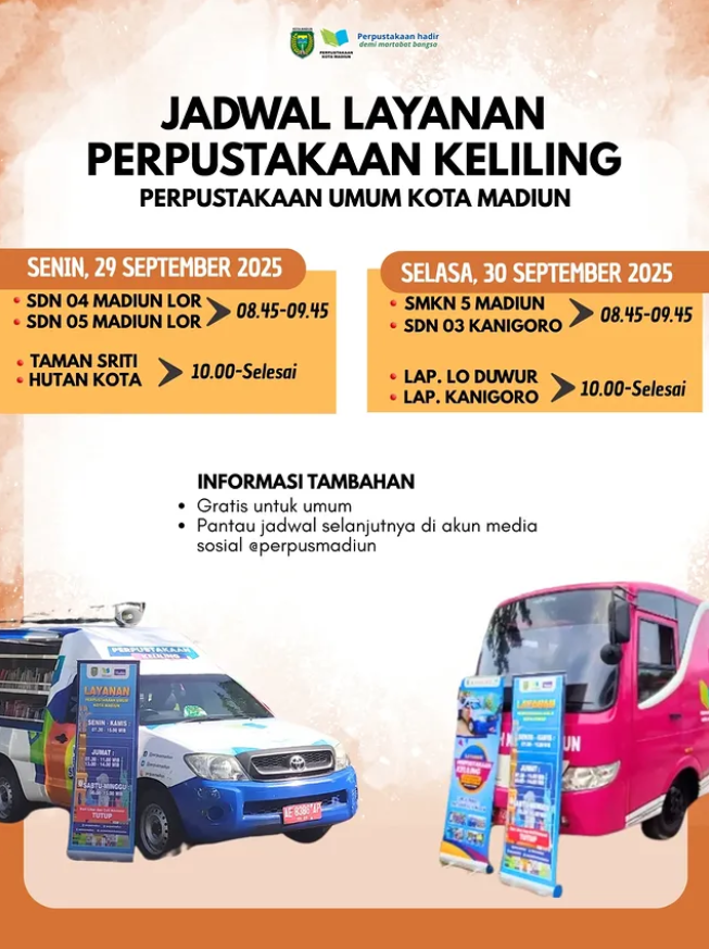Jadwal Layanan Mobil Perpustakaan Keliling Akhir September September 28, 2025 admin Jadwal Layanan Mobil Perpustakaan Keliling akhir September tetap menyapa seluruh warga kota.. Ayo datangi dan manfaatkan ribuan buku yang ada.. Salam Literasi..
