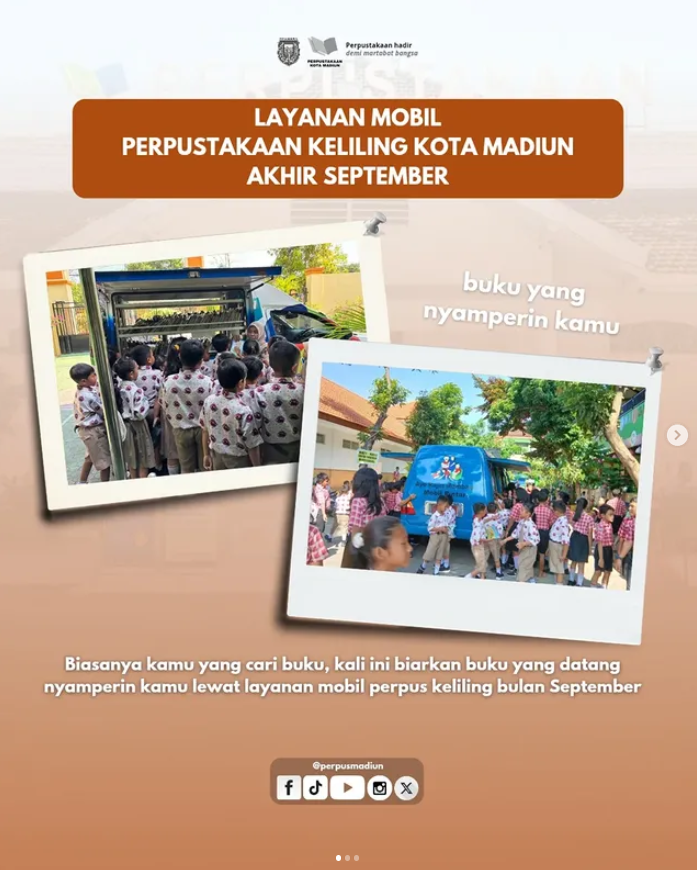 Masa Renovasi Tidak Perlu Repot ke Perpustakaan September 28, 2025 admin Selama masa renovasi gedung kalian tidak perlu repot-repot ke perpustakaan sebab Layanan Mobil Perpustakaan Keliling menjangkau seluruh wilayah Kota Madiun.. Salam Literasi..