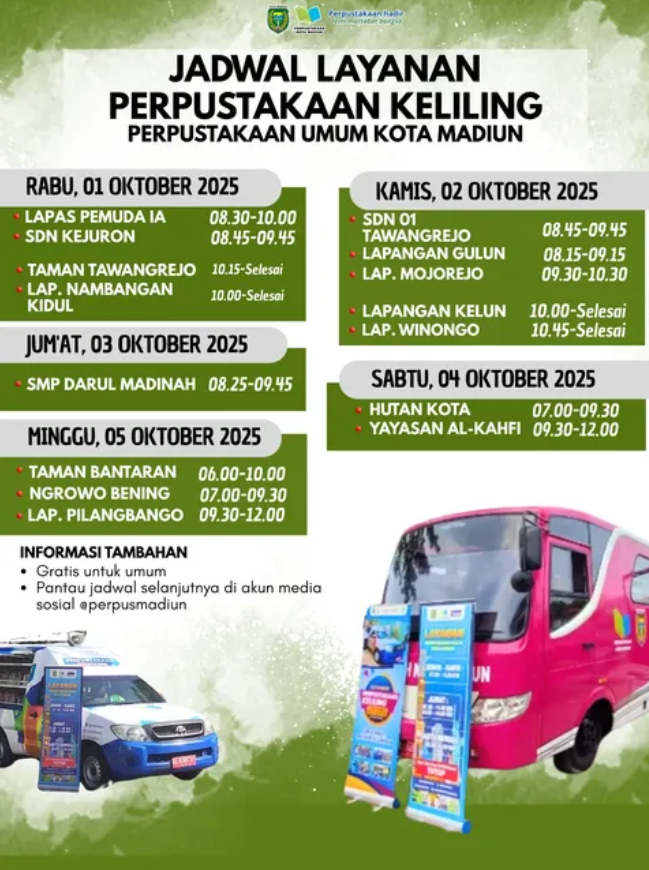 Yuk ikuti Layanan Mobil Perpustakaan Keliling October 1, 2025 admin Yuk ikuti Layanan Mobil Perpustakaan Keliling Kota Madiun awal Oktober 2025! Nikmati serunya membaca lebih dekat di sekolah, lapangan, hingga ruang publik. Gratis untuk umum, jangan lewatkan jadwalnya ya.. Salam Literasi.. .. ..