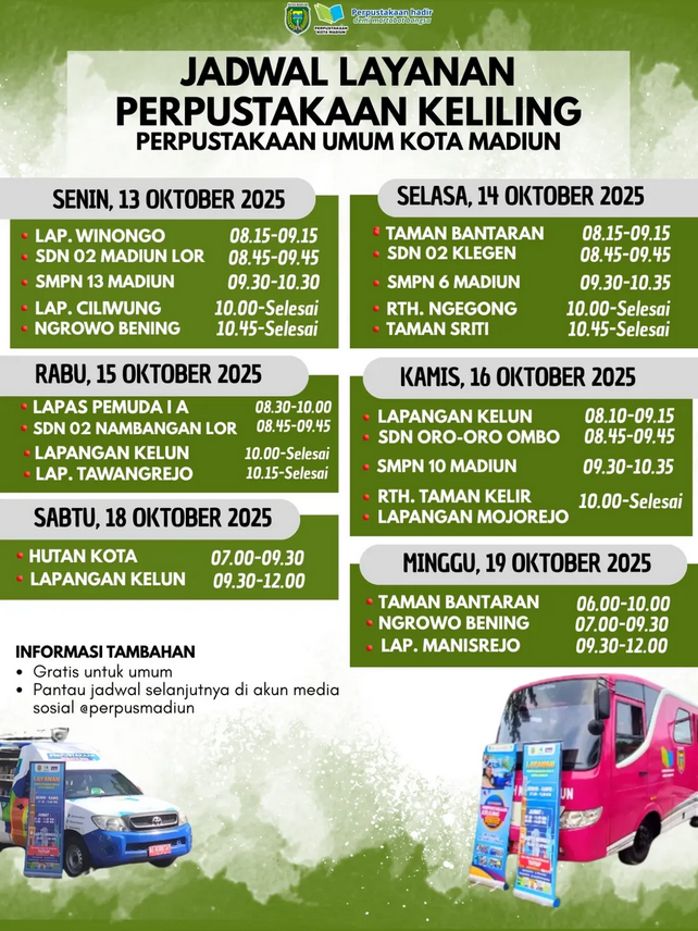 Jangan lewatkan layanan perpustakaan keliling Perpusda Kota Madiun edisi Oktober 2025. Yuk mampir di lokasi terdekat dan nikmati serunya baca buku di ruang terbuka..