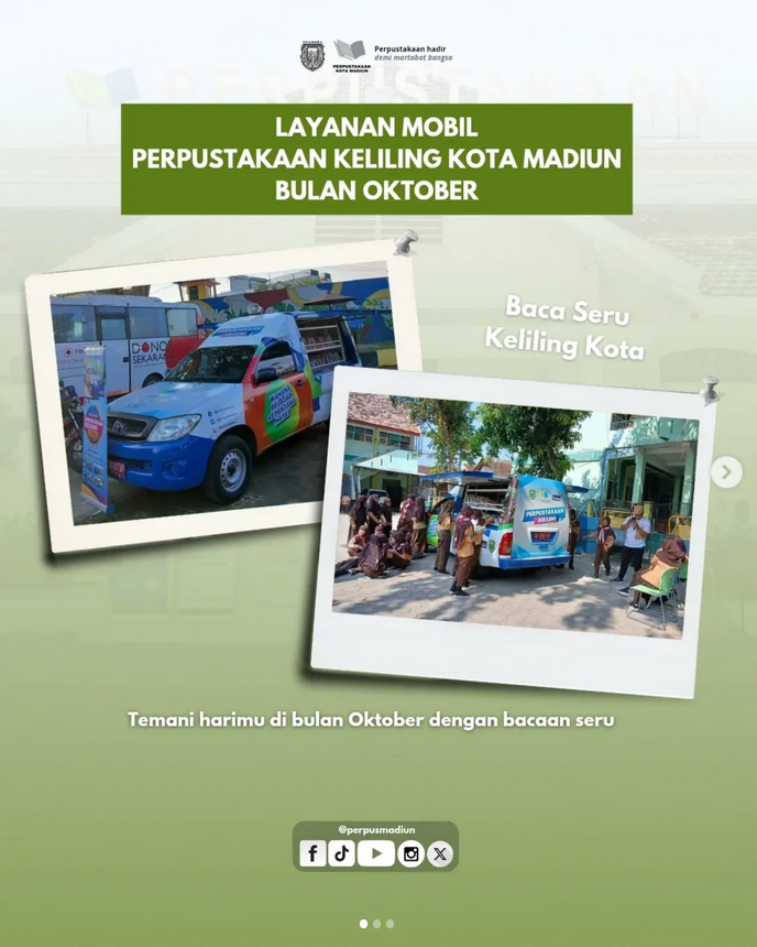 Yuk manfaatkan kunjungan mobil perpustakaan di wilayahmu! Pilih buku favoritmu, nikmati waktu membaca yang menyenangkan, dan jadikan membaca bagian dari keseharian kita..