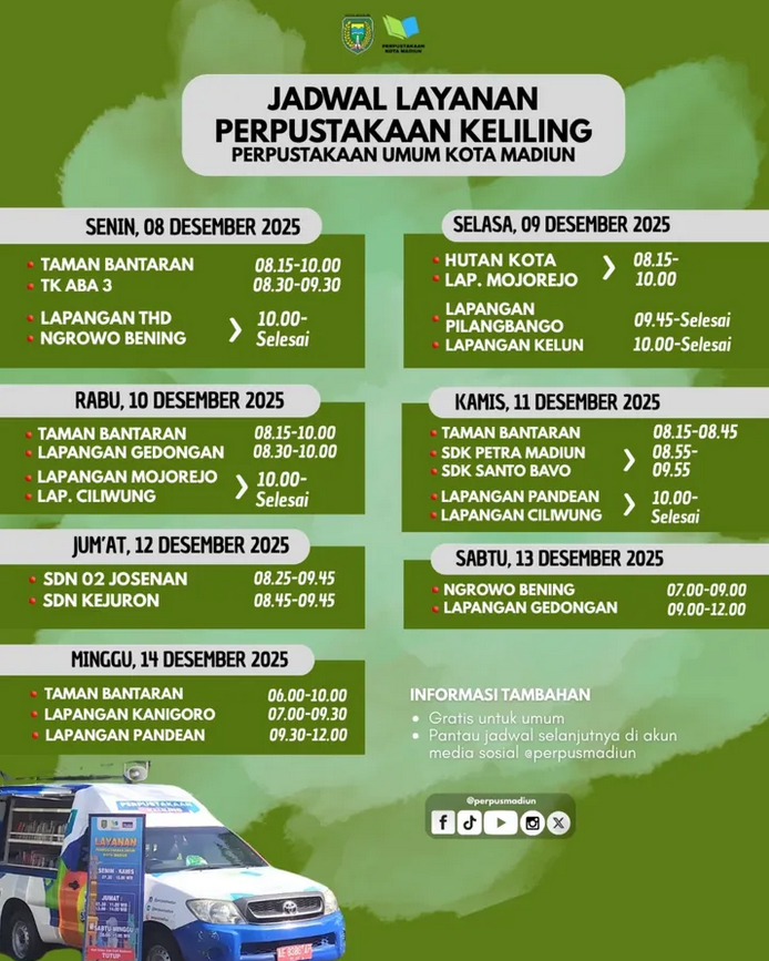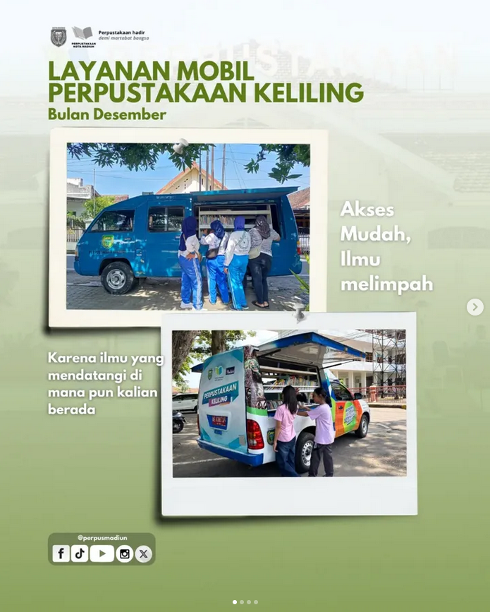 Desember bersama Perpustakaan Keliling. Layanan perpustakaan keliling Perpusda Kota Madiun edisi akhir tahun 2025 berlanjuuuut. Yuk mampir di lokasi terdekat…