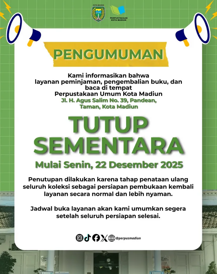 Kami informasikan bahwa layanan peminjaman, pengembalian buku, dan baca di tempat, Perpustakaan Umum Kota Madiun.. TUTUP SEMENTARA Mulai Senin, 22…